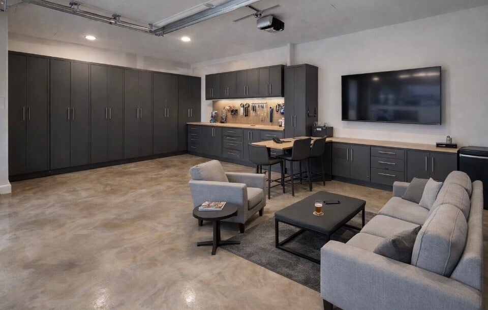 Maximize your garage space with custom storage solutions, epoxy flooring, and functional workspaces. Create the perfect hangout spot!
